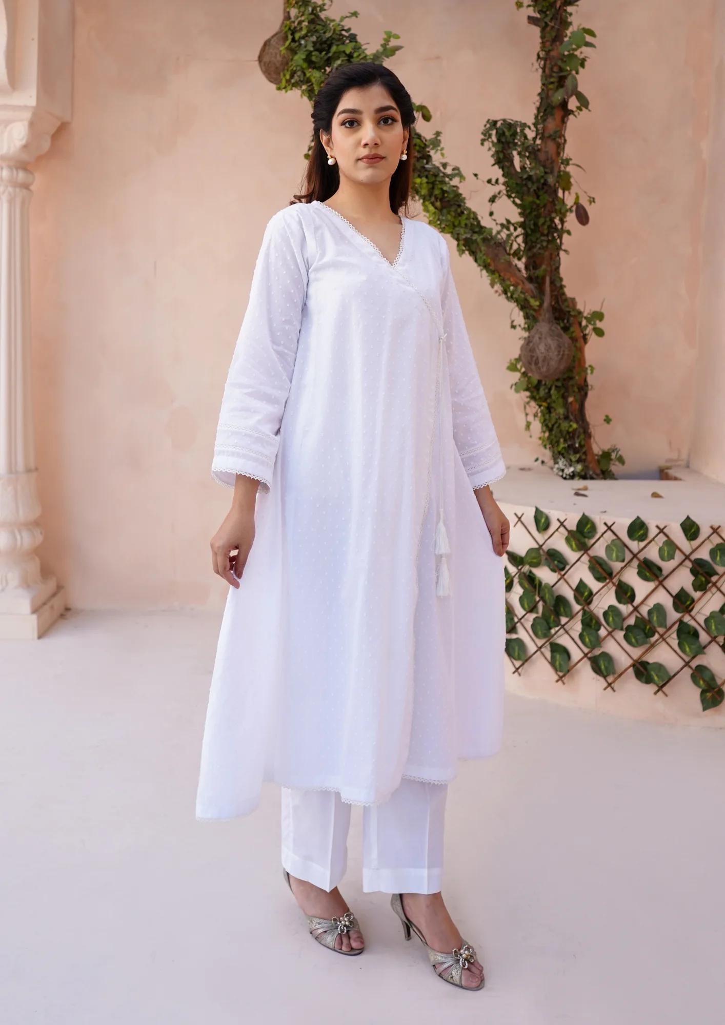 This Broshia Jacquard Lawn Angrakha Frock is made with a textured fabric, providing a unique and eye-catching appearance. Its angrakha style adds a touch of traditional flair to any outfit. Perfect for those looking for a blend of modern and classic fashion.