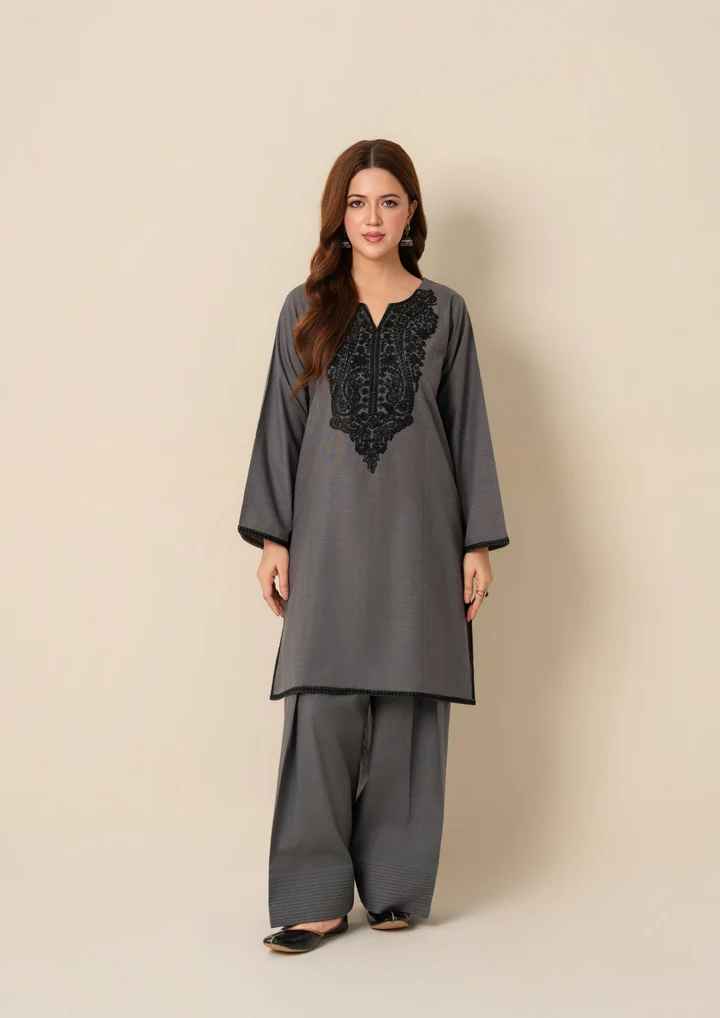 Elevate your winter wardrobe with this 2-piece Embroidered Khaddar set, designed for effortless elegance and comfort. The ensemble features a adorned with intricate black embroidery on the neckline and front panel, giving it a refined yet timeless appeal. Paired with a classic farshi shalwar, this outfit strikes the perfect balance between tradition and contemporary style.