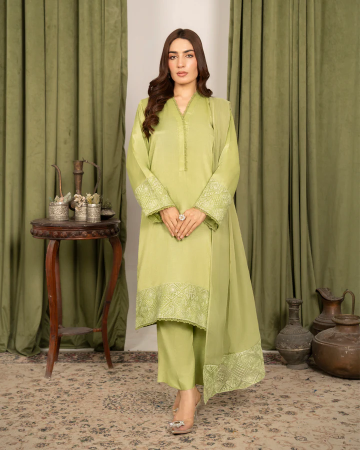 • Dupatta: Completing this formal ensemble is a lightweight Chiffon dupatta in the same serene pistachio green. It is beautifully finished with coordinating embroidered borders on two pallu sides, echoing the intricate work on the shirt and adding a touch of refined grace.