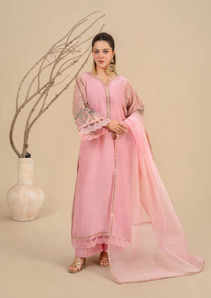 Grace your festive wardrobe with this elegant 3-piece silk viscose suit, designed for a timeless Pakistani look. The shirt is crafted from premium silk viscose in a soft, flowy texture, featuring refined embroidery on the neckline and beautifully detailed embroidered sleeves with lace finishing. It is paired with a matching silk viscose trouser for comfort and a coordinated silhouette. The outfit is completed with a lightweight sheer organza dupatta, adding a soft, graceful drape.