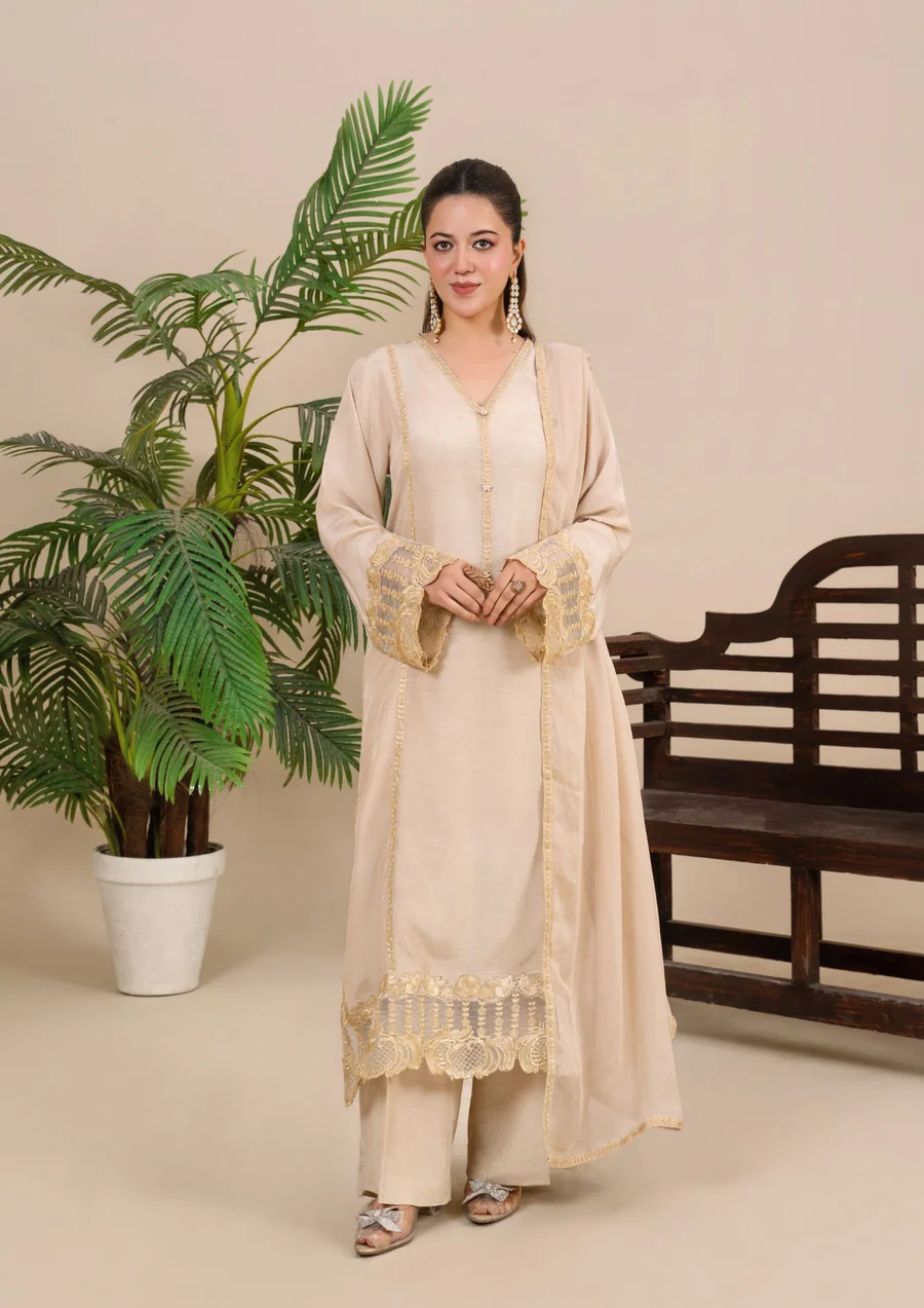 3Pc Embroidered Silk Viscose Ivory Beige JASHAN-J26-0022