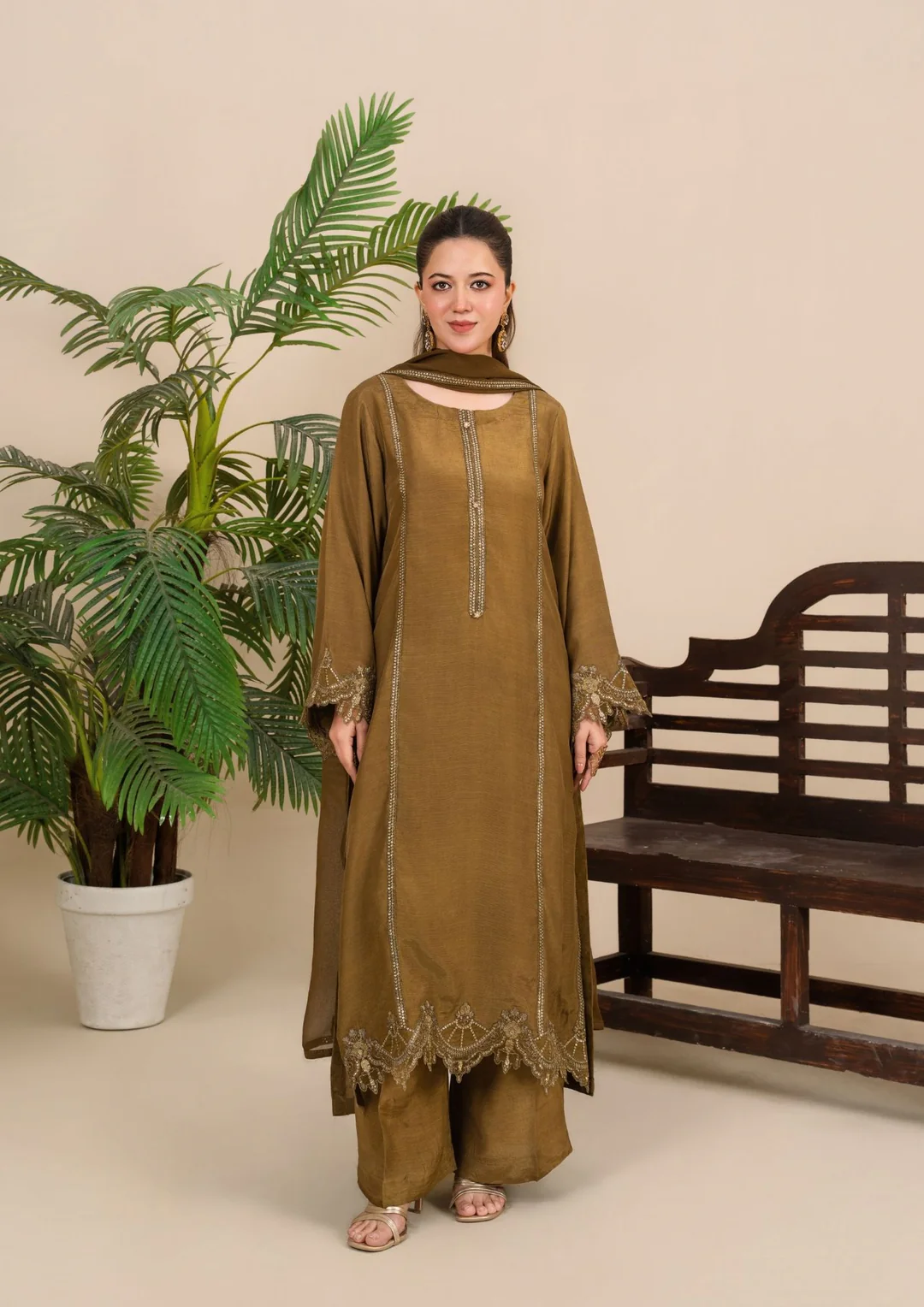 Crafted in a rich olive-brown tone, this elegant 3-piece ensemble is madefrom premium silk viscose, offering a soft texture with a graceful, fluid drape. The straight-cut shirt features refined embellishment detailing along the neckline and vertical panels, complemented by delicate embroidery on the sleeves and hem for a subtle yet luxurious finish.