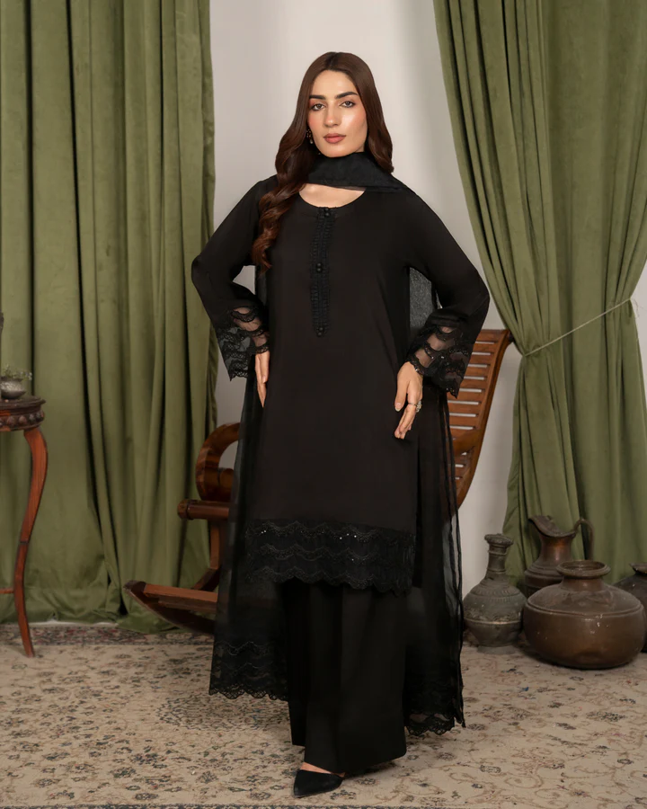 • Dupatta: Completing this formal masterpiece is a Chiffon dupatta in the same rich black. It is gracefully finished with a coordinating wide lace border on all four sides, intricately detailed and lightly sprinkled with sequins, perfectly echoing the embellishments on the shirt.