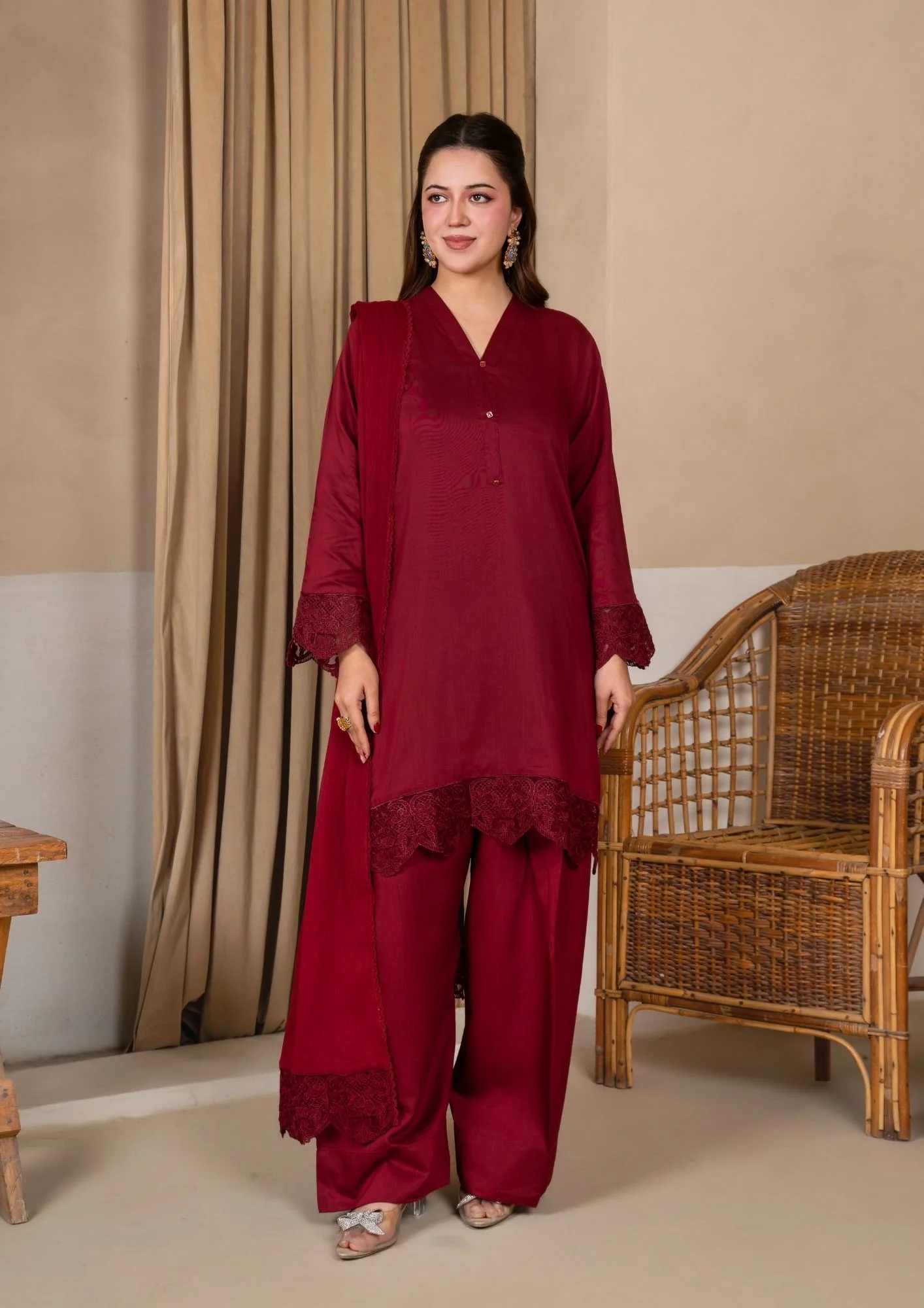 Introducing our luxurious 3-piece set, perfect for formal wear. An elegant combination of Raw Silk and Chiffon, adorned with intricate embroidery, including a premium embroidered bordered dupatta.
