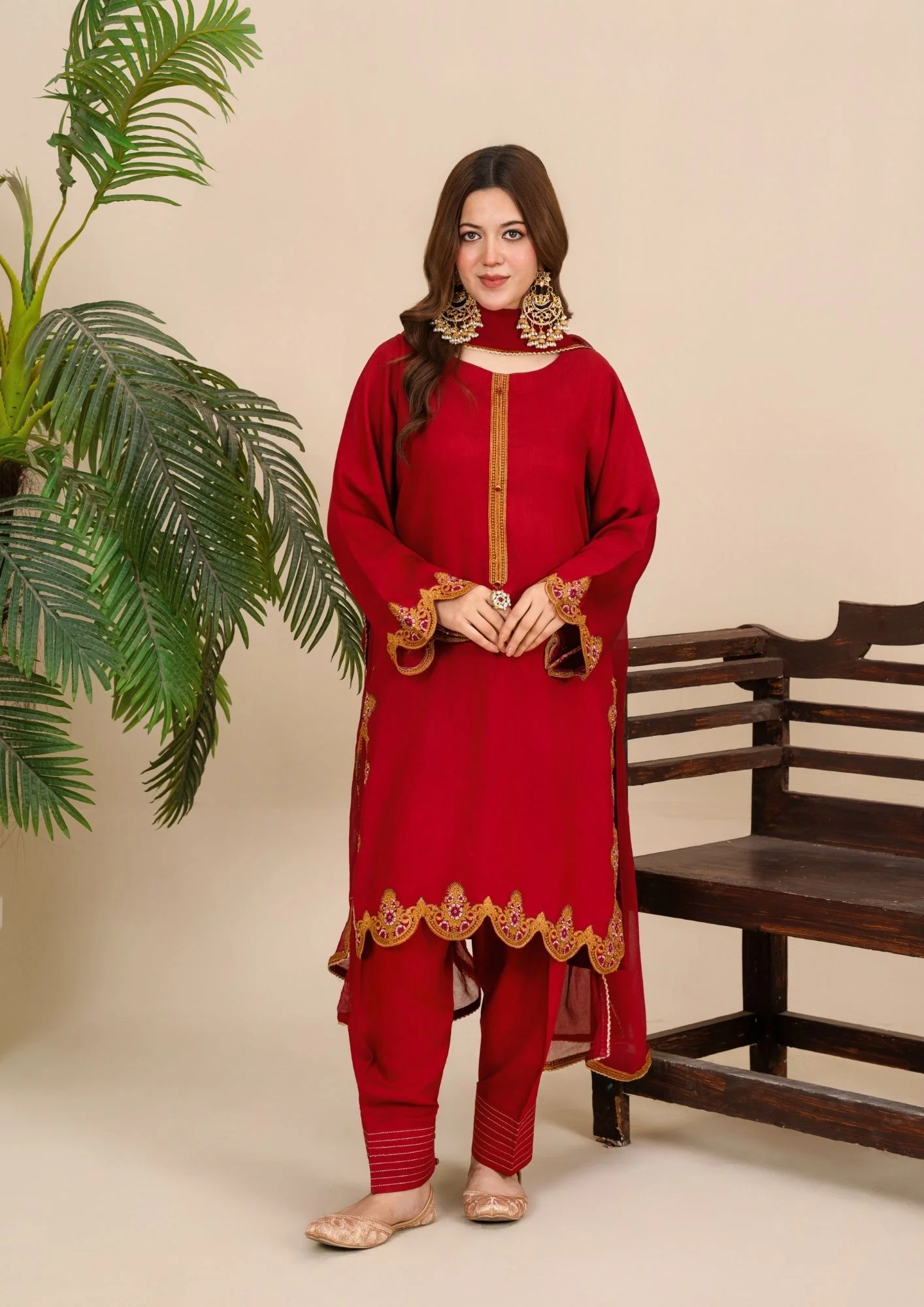 Designed in a striking deep red hue, this elegant 3-piece ensemble is crafted from premium silk viscose, offering a smooth texture and graceful drape. The straight-cut shirt is beautifully enhanced with intricate gold embroidery along the neckline, sleeves, and scalloped hem, adding a regal touch to its timeless silhouette.